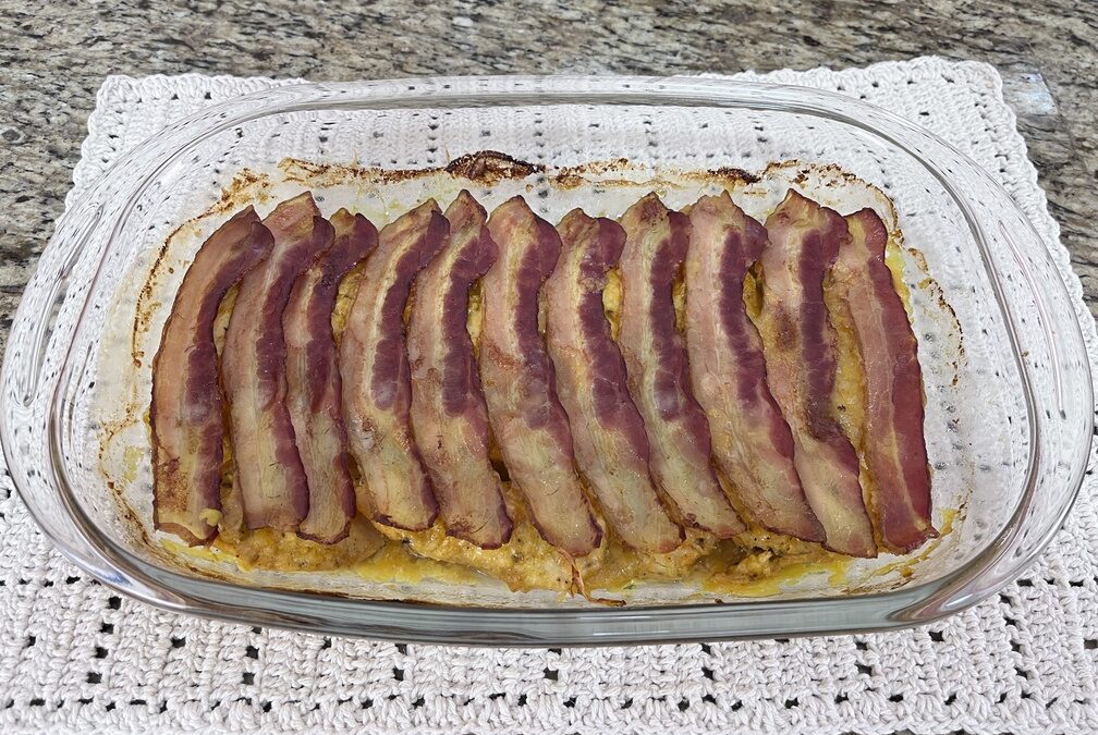 - Leve ao forno por aproximadamente 30 a 40 minutos até que o bacon e o queijo comecem a dourar.